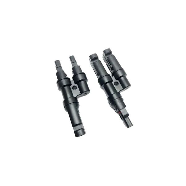 Ζεύγος διακλαδωτών σύνδεσης τύπου MC4-Y, ιδανικό για παράλληλη σύνδεση φωτοβολταϊκών πάνελ. Περιλαμβάνει ένα τεμάχιο με 1 αρσενικό σε 2 θηλυκά (1x M-2F) και ένα τεμάχιο με 1 θηλυκό σε 2 αρσενικά (1x F-2M). Παρέχει ασφαλή, στεγανή και αξιόπιστη σύνδεση με χαμηλή πτώση τάσης και αντοχή σε εξωτερικές συνθήκες.