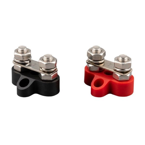 Το σετ Dual Terminal Stud M8-linked περιλαμβάνει δύο συνδεδεμένους ακροδέκτες (έναν κόκκινο και έναν μαύρο), κατάλληλους για ασφαλή και τακτοποιημένη διασύνδεση καλωδίων.